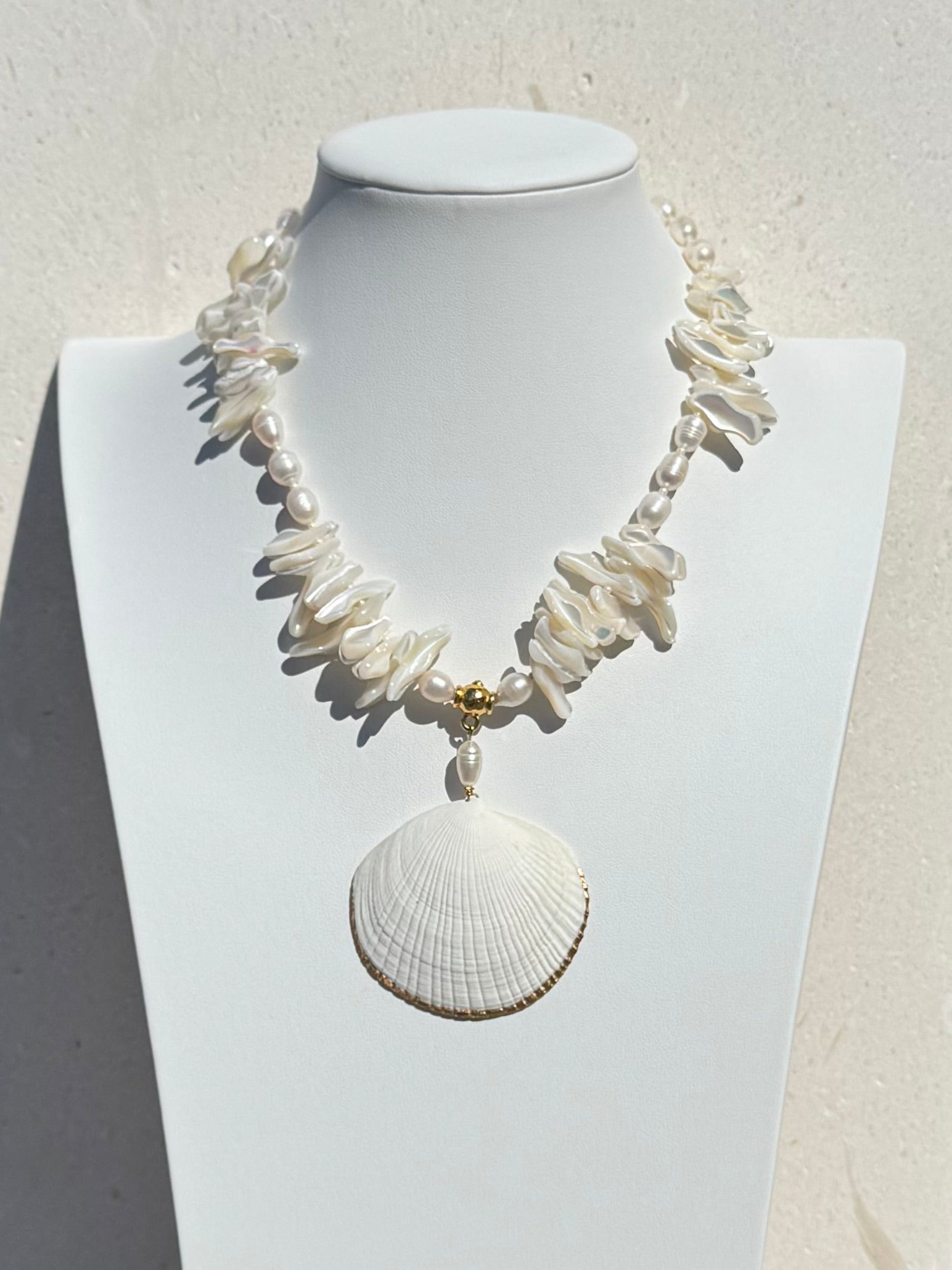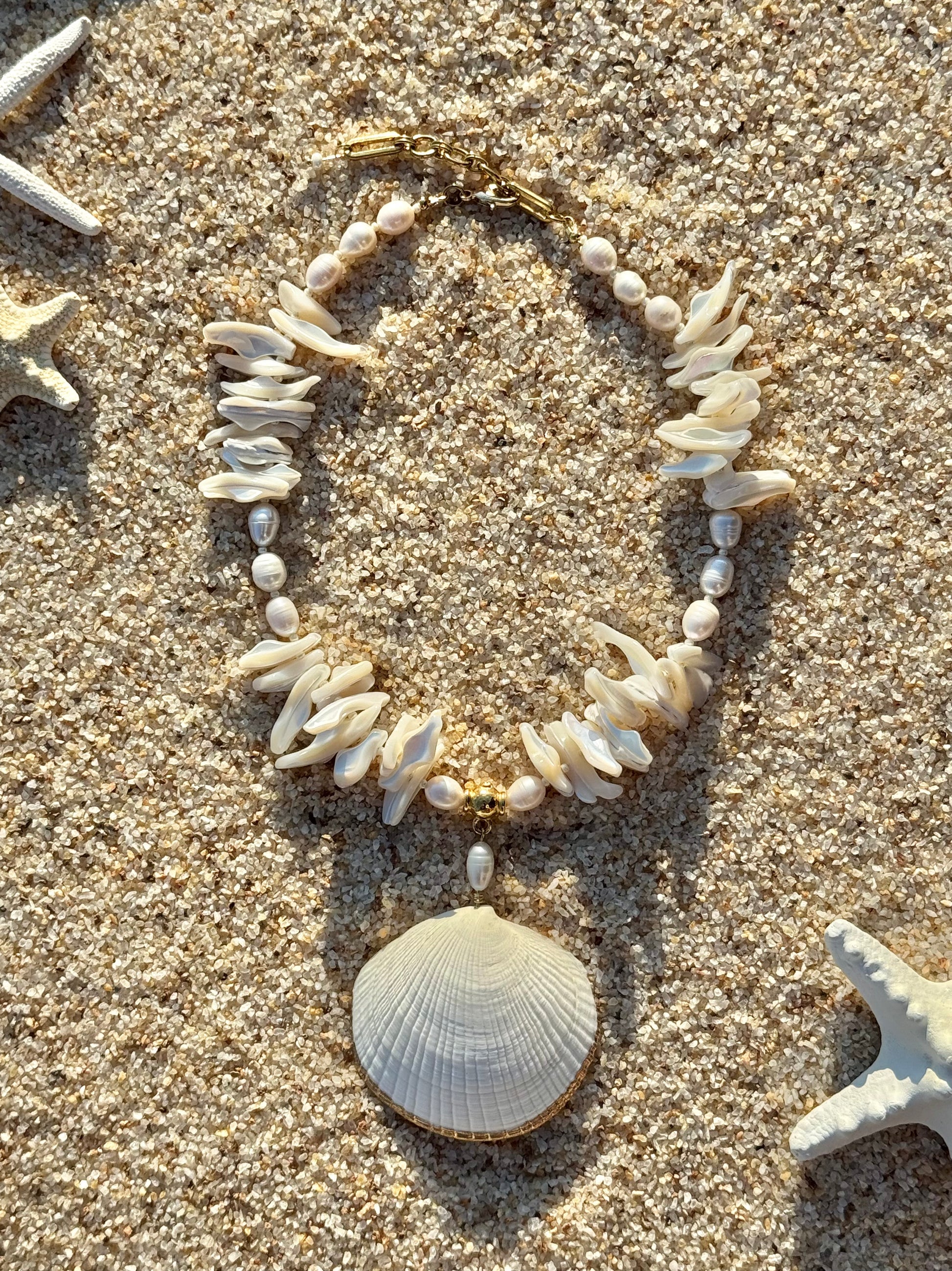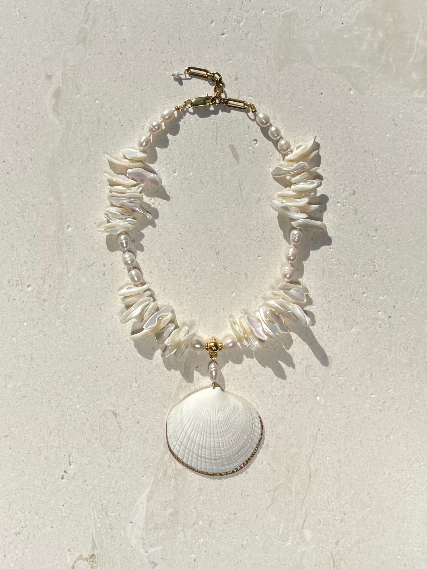 Size & Fit: The necklace is completed with a gold-plated brass hook and adjustable chain, offering a fit from 18" to 19.5". Each clam shell, pearl, and frangia strand is unique, carrying delicate variations in hue and form that honor their natural origins.