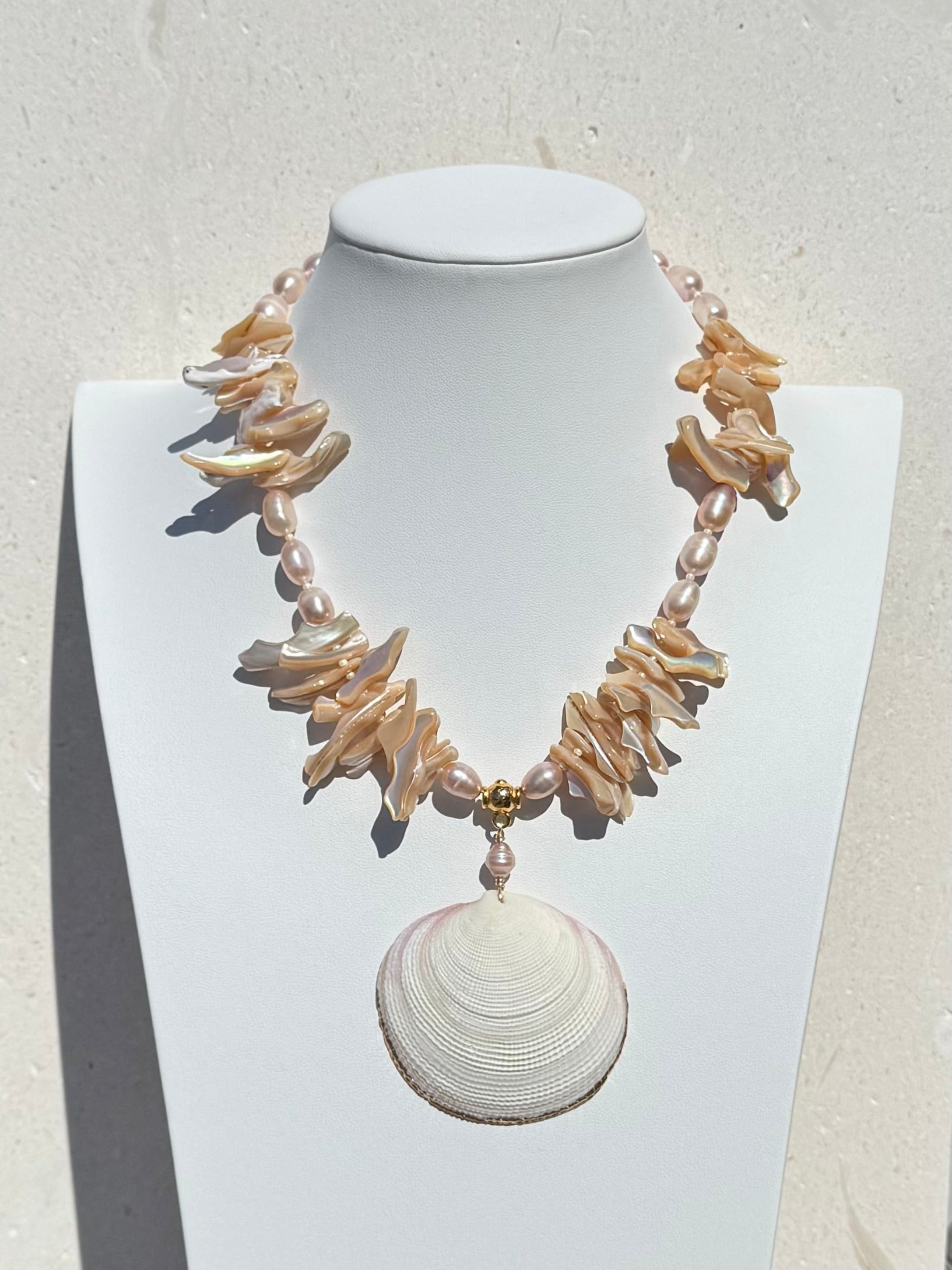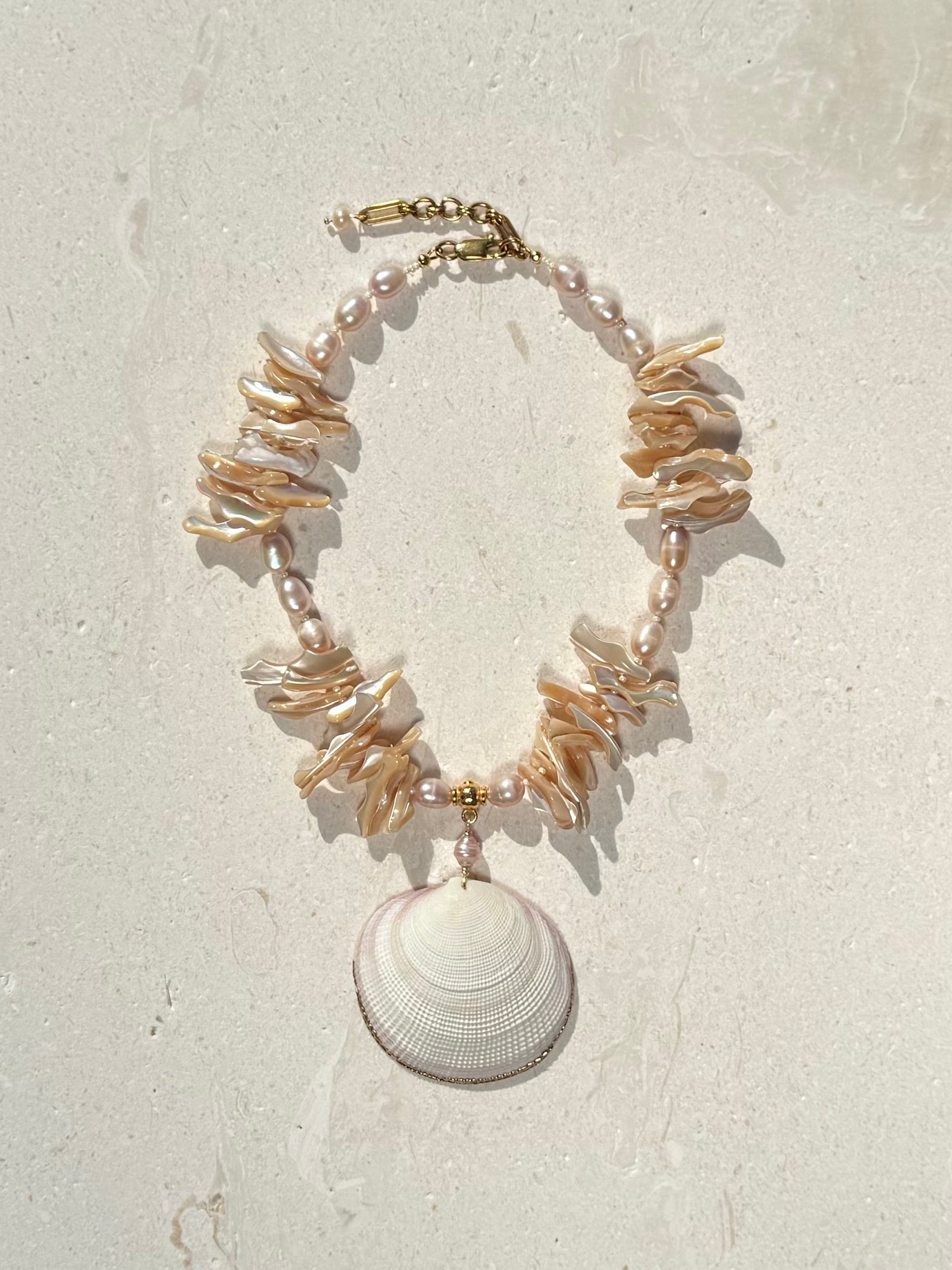 Step into the magic of the sea with our Marama Necklace, a celebration of Bora Bora’s timeless beauty. At its heart rests a striking tiger clam shell, polished by nature into a work of art. Natural mother-of-pearl shimmer like sunlight on the waves, weaving gracefully with natural pearls whose luster recalls the ocean’s hidden treasures. Hand applied gold leaf frames the shell's contour.