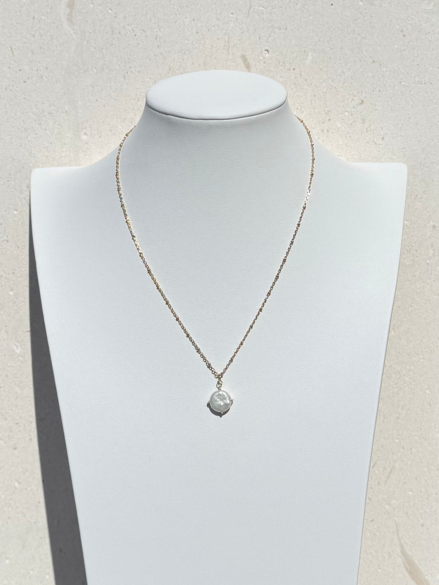 The Reanah in Gold embodies timeless elegance with a modern twist. Delicately plated in gold, this exquisite piece features a striking white coin pearl pendant, measuring 22.3mm long x 14.6mm wide, suspended from a delicate chain.
