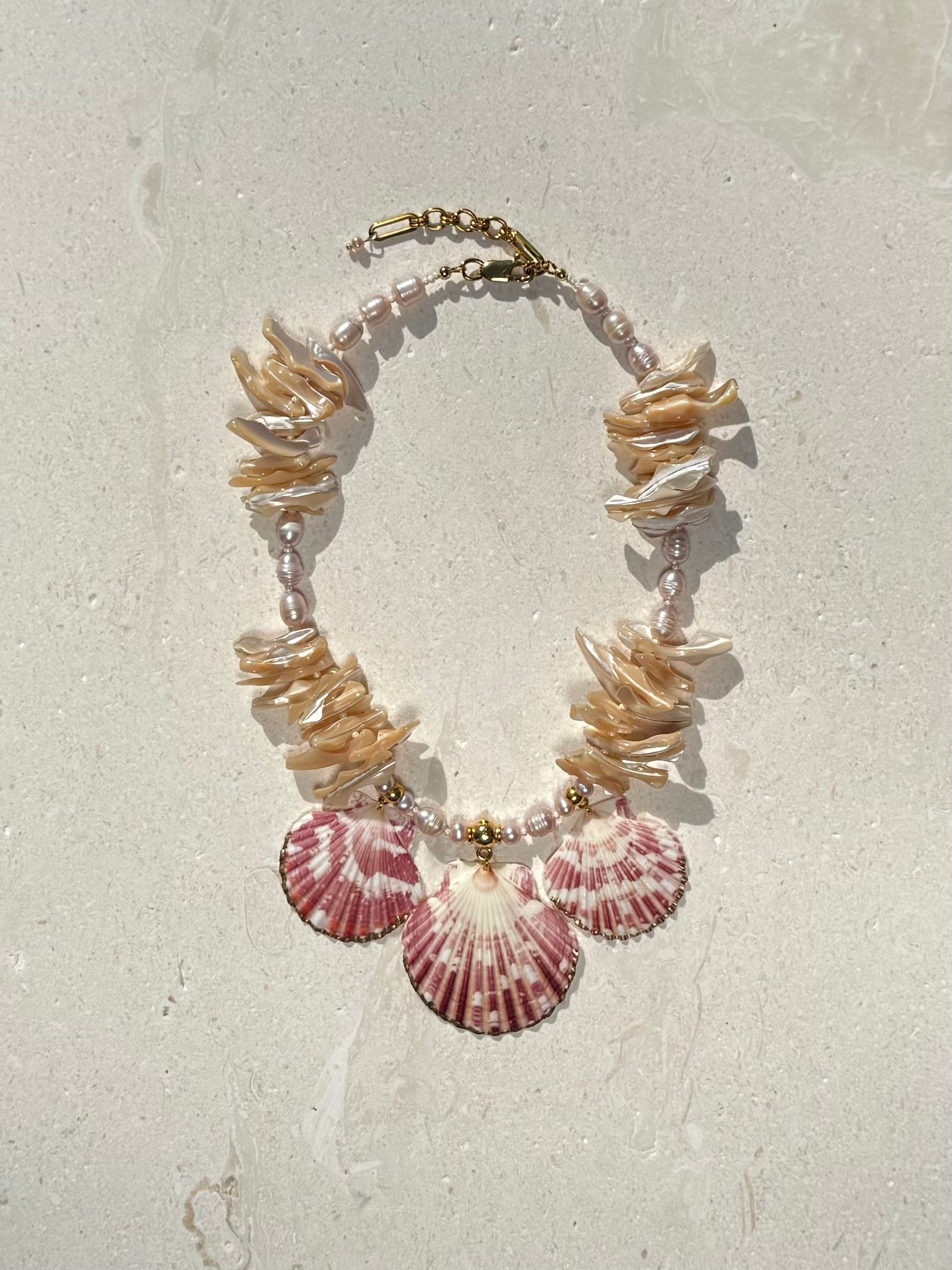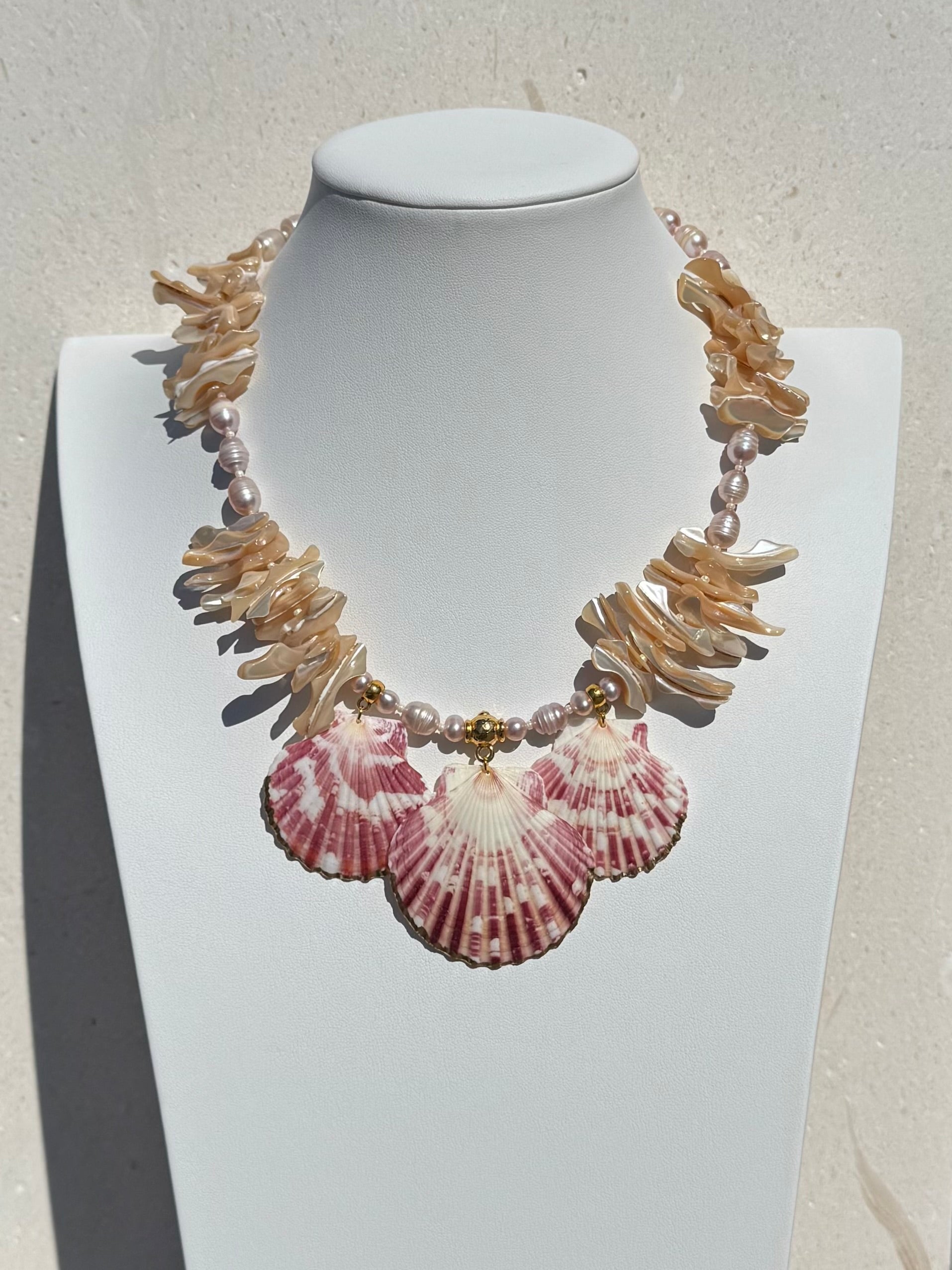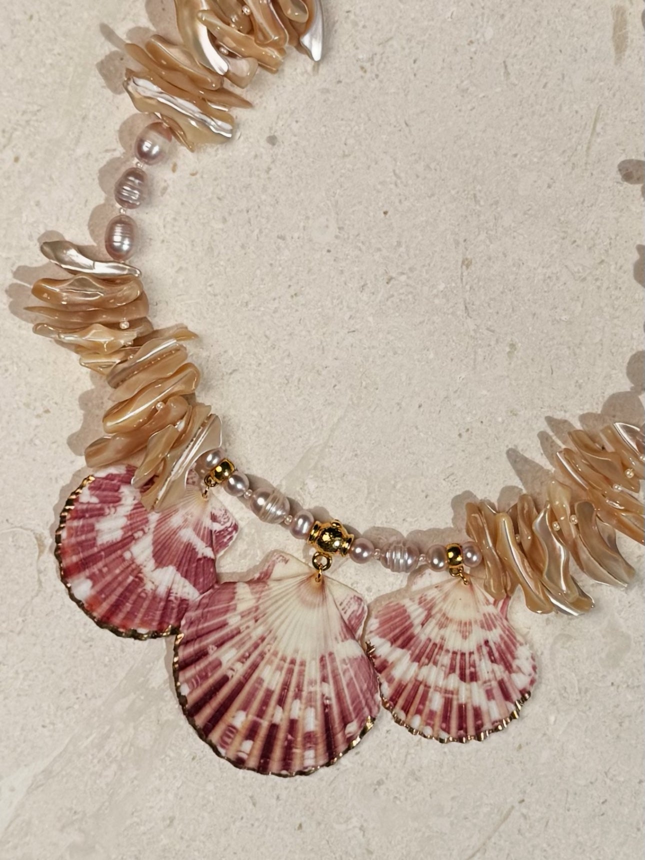 Embrace the ocean’s timeless allure with The Tiare Necklace, a delicate tribute to the sea’s treasures. This piece features lustrous calico scallop shells, their creamy white curves kissed with soft pink hues, reminiscent of dawn-lit shores. Interwoven with natural blush and mauve pearls, the design glows with elegance, enhanced by warm gold-plated hardware that catches the light like sun on waves.