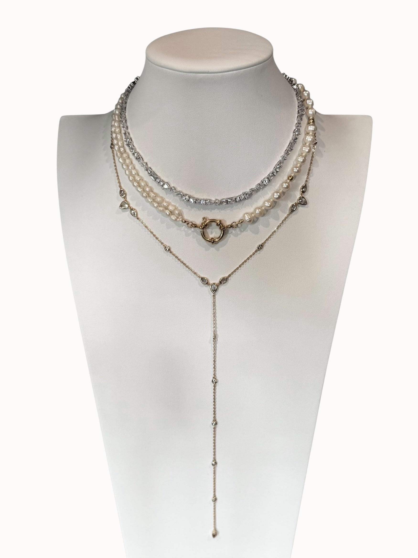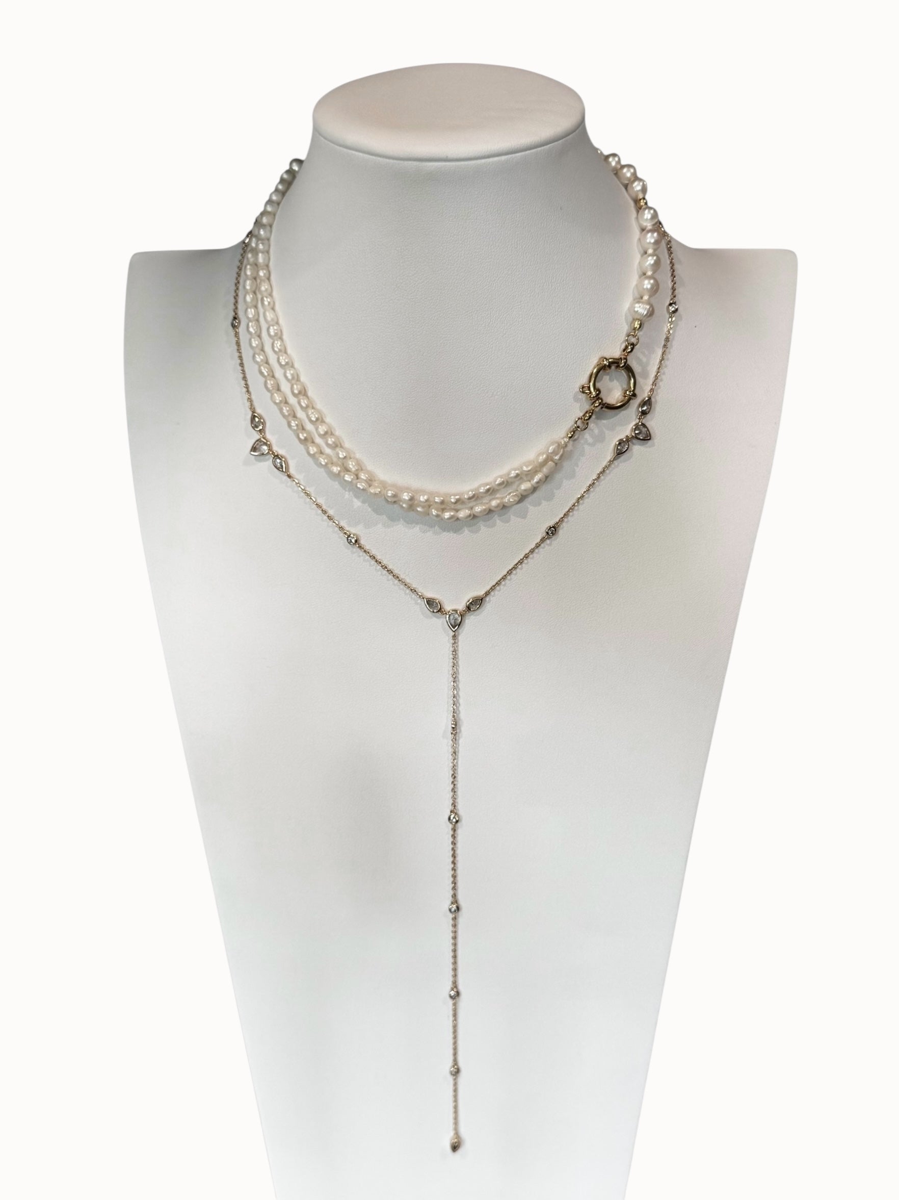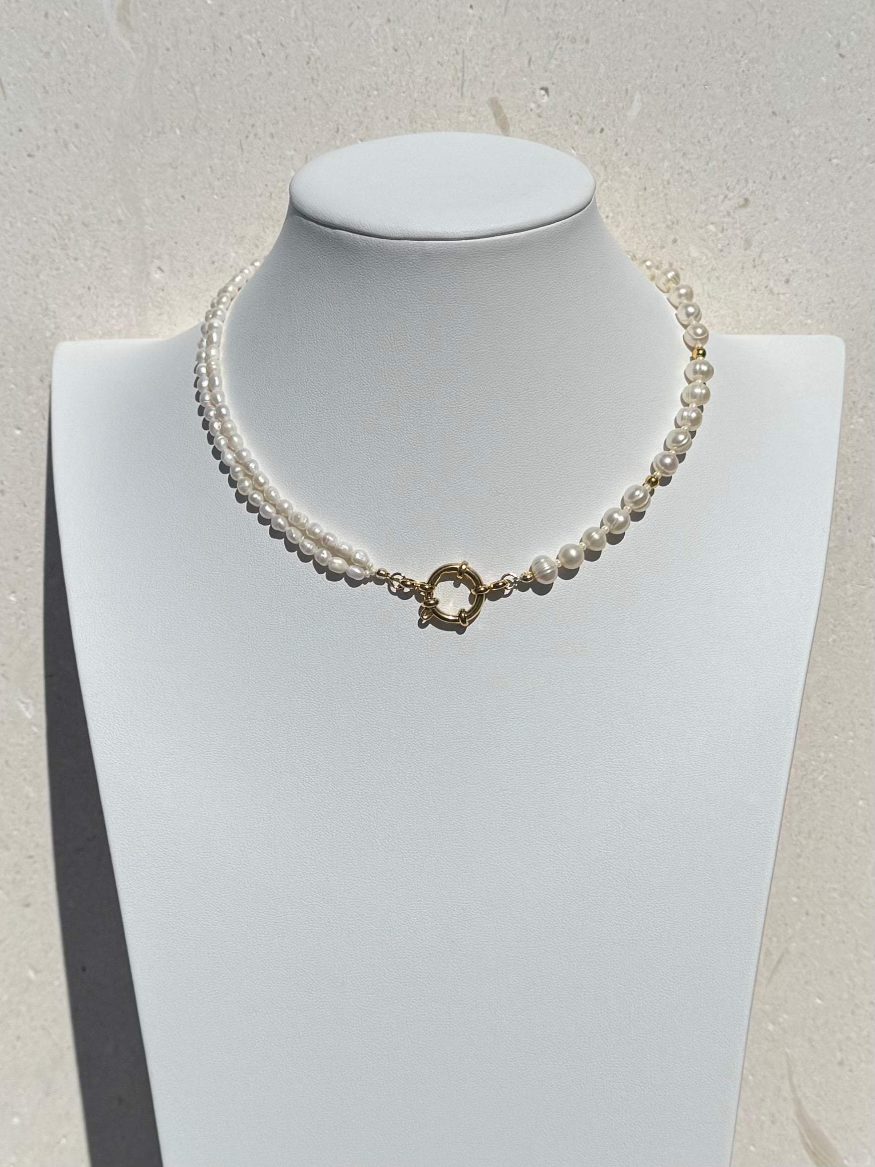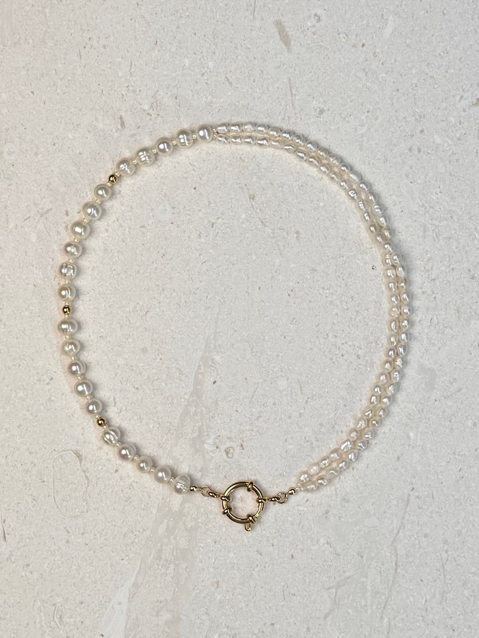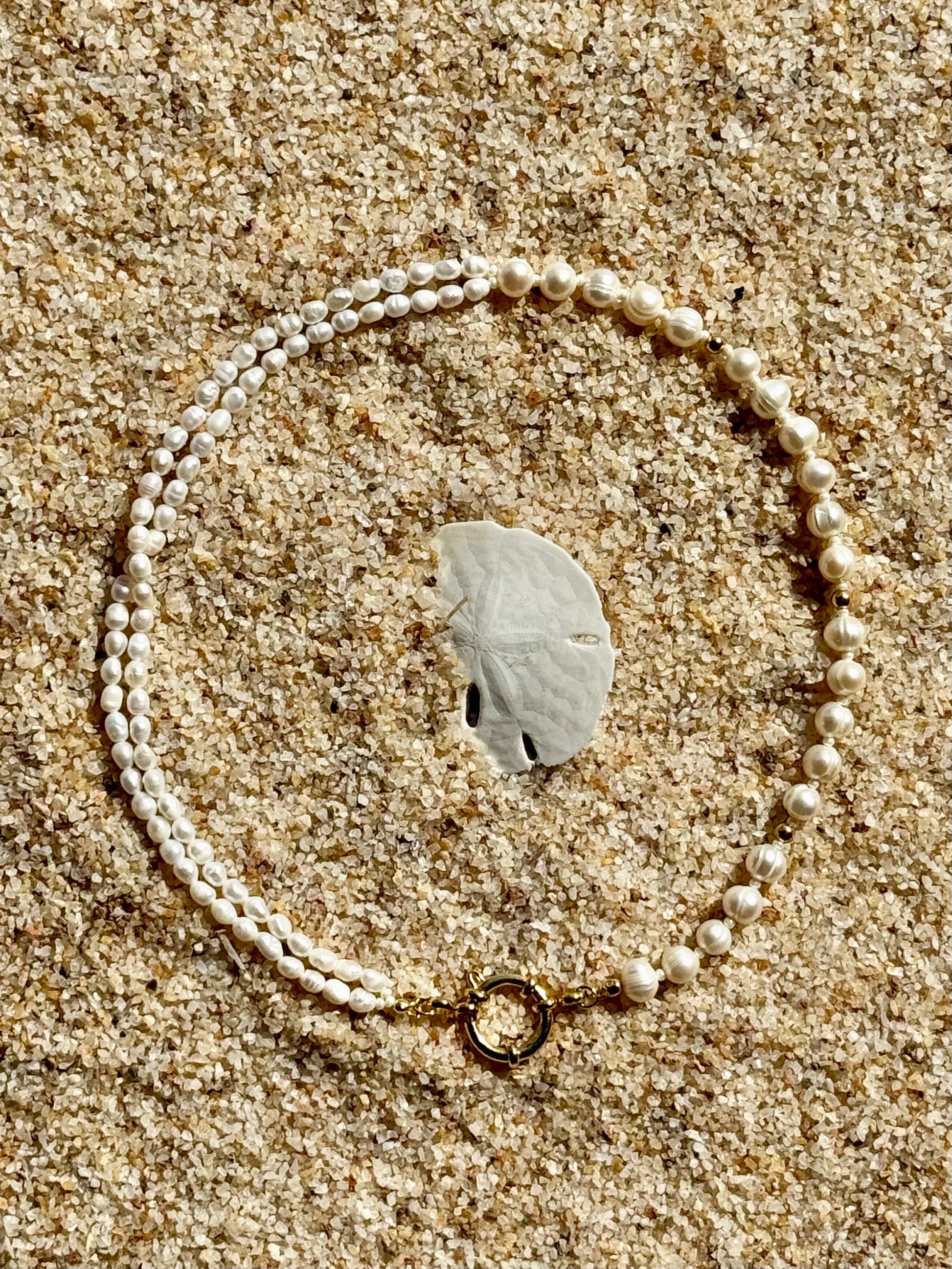 A tribute to timeless femininity, the Vahine Necklace embodies strength, beauty, and elegance. Natural pearls lead gracefully into a double strand of lustrous freshwater pearls, joined by a gold-plated toggle clasp that balances refinement with ease. Designed as a versatile staple, it can be worn alone for understated elegance or layered to create a bolder statement. Each pearl carries its own subtle individuality, honoring the natural beauty of the sea.