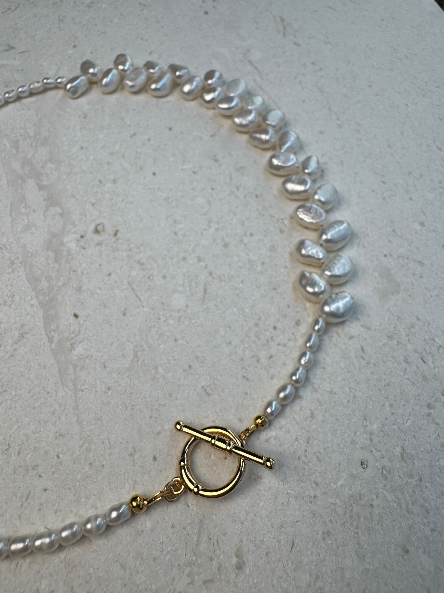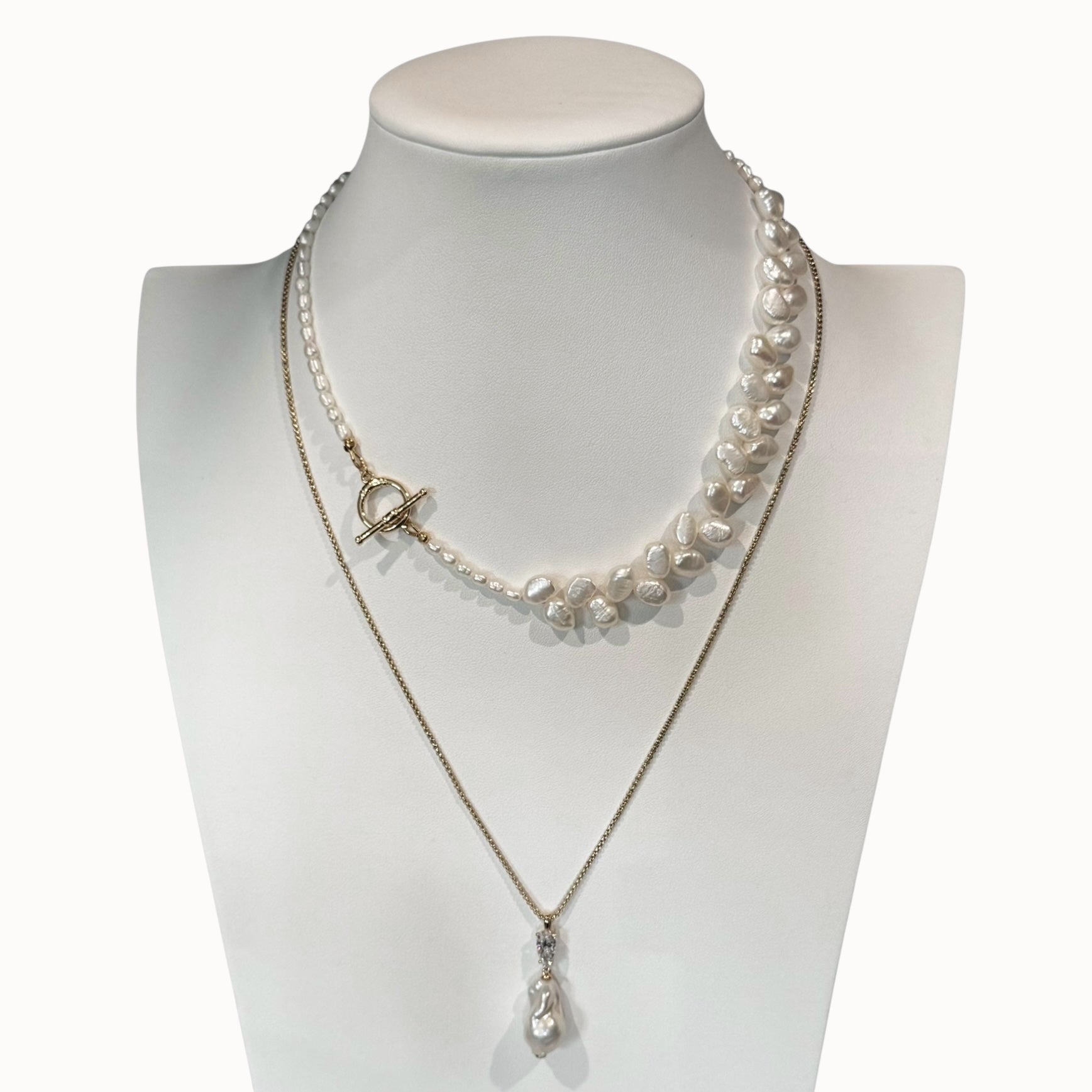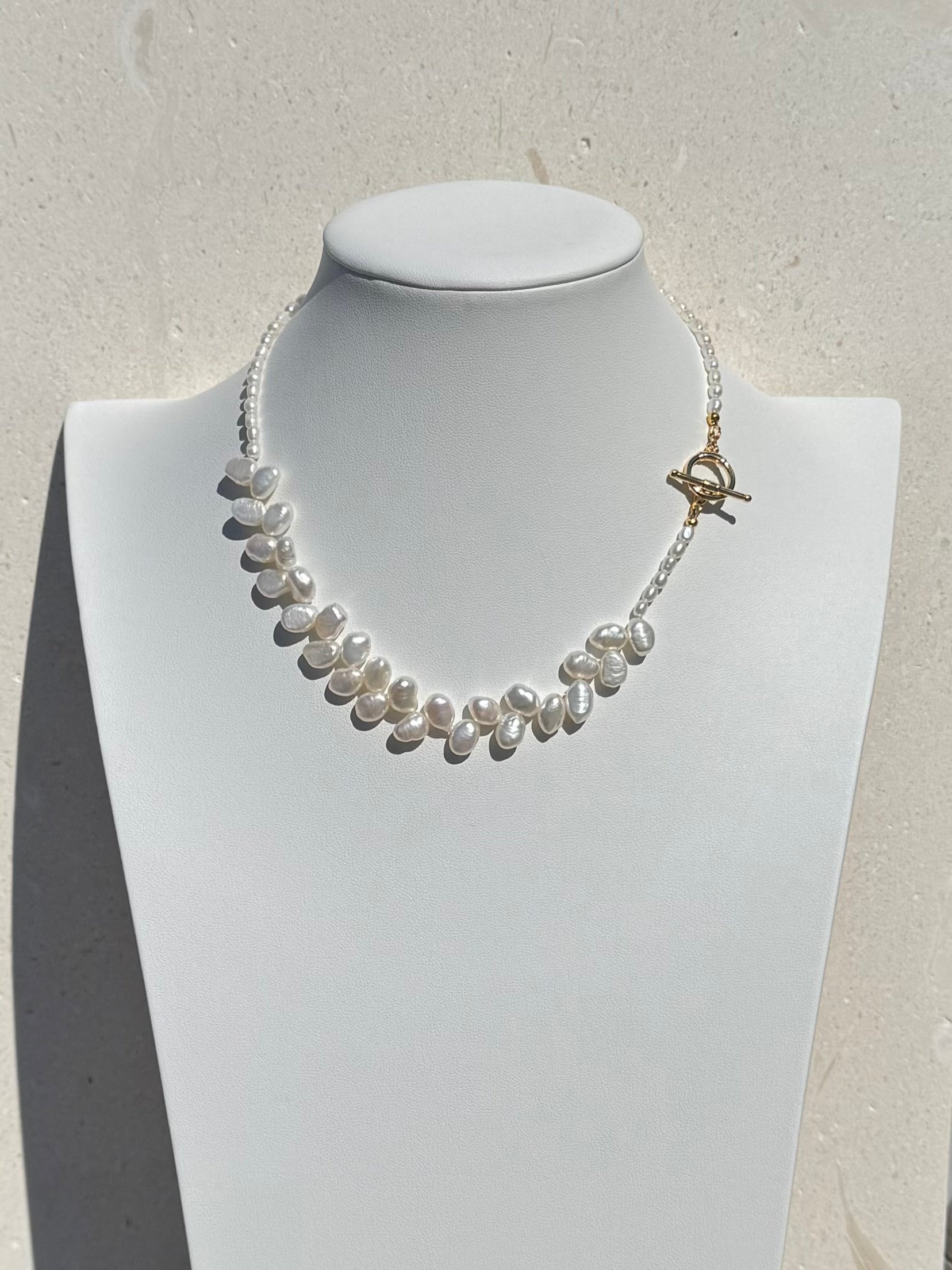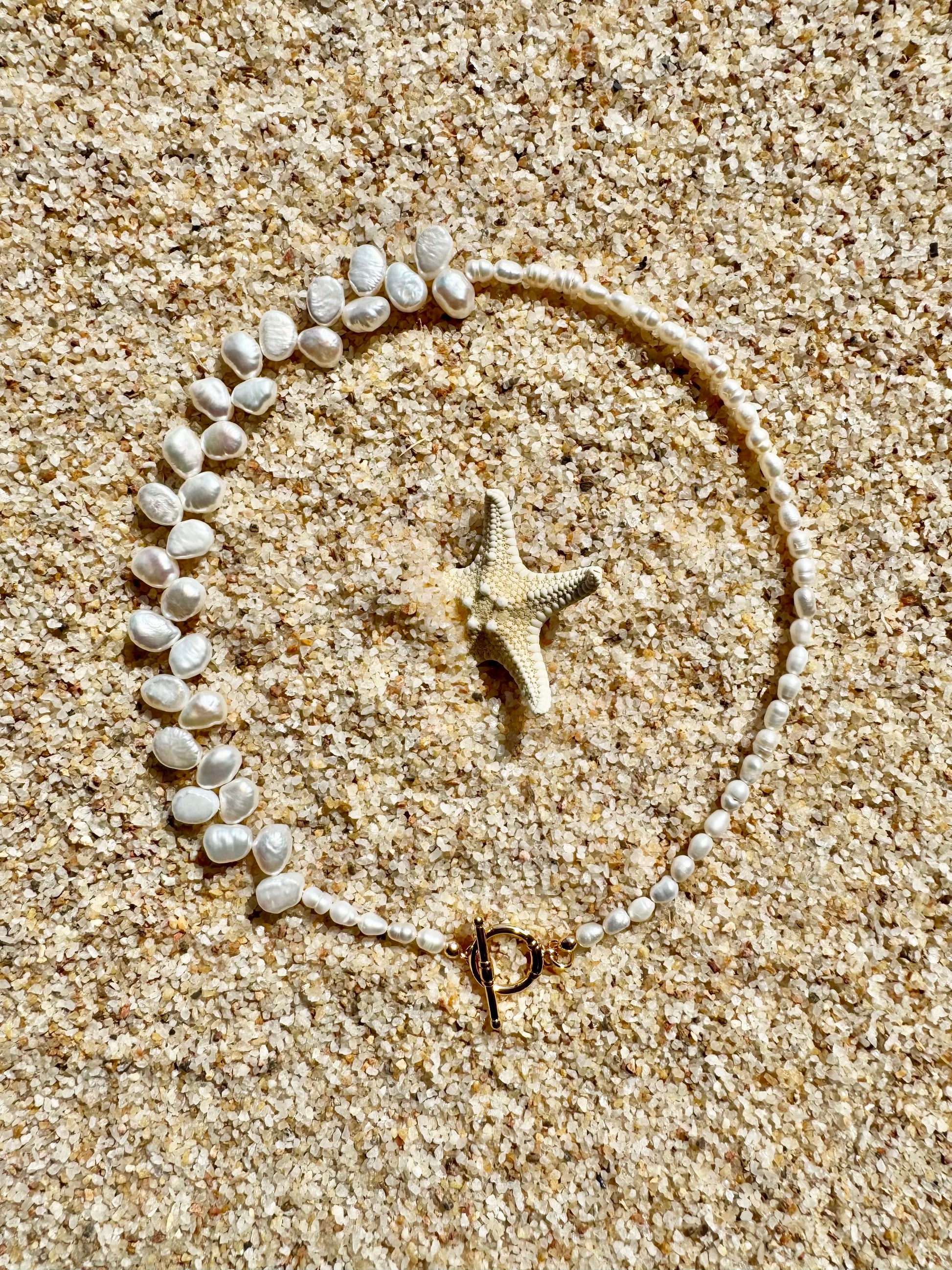 A tribute to timeless elegance, the Vairéa exudes sophistication and feminine allure. A single strand of lustrous freshwater pearls meets a striking herringbone arrangement of baroque pearls at the gold-plated toggle clasp, offering a versatile design that can be worn with the clasp facing down, off to the side or hidden altogether. This classic staple blends basic beauty with sexy charm, perfect as a standalone piece or layered for a bolder statement.