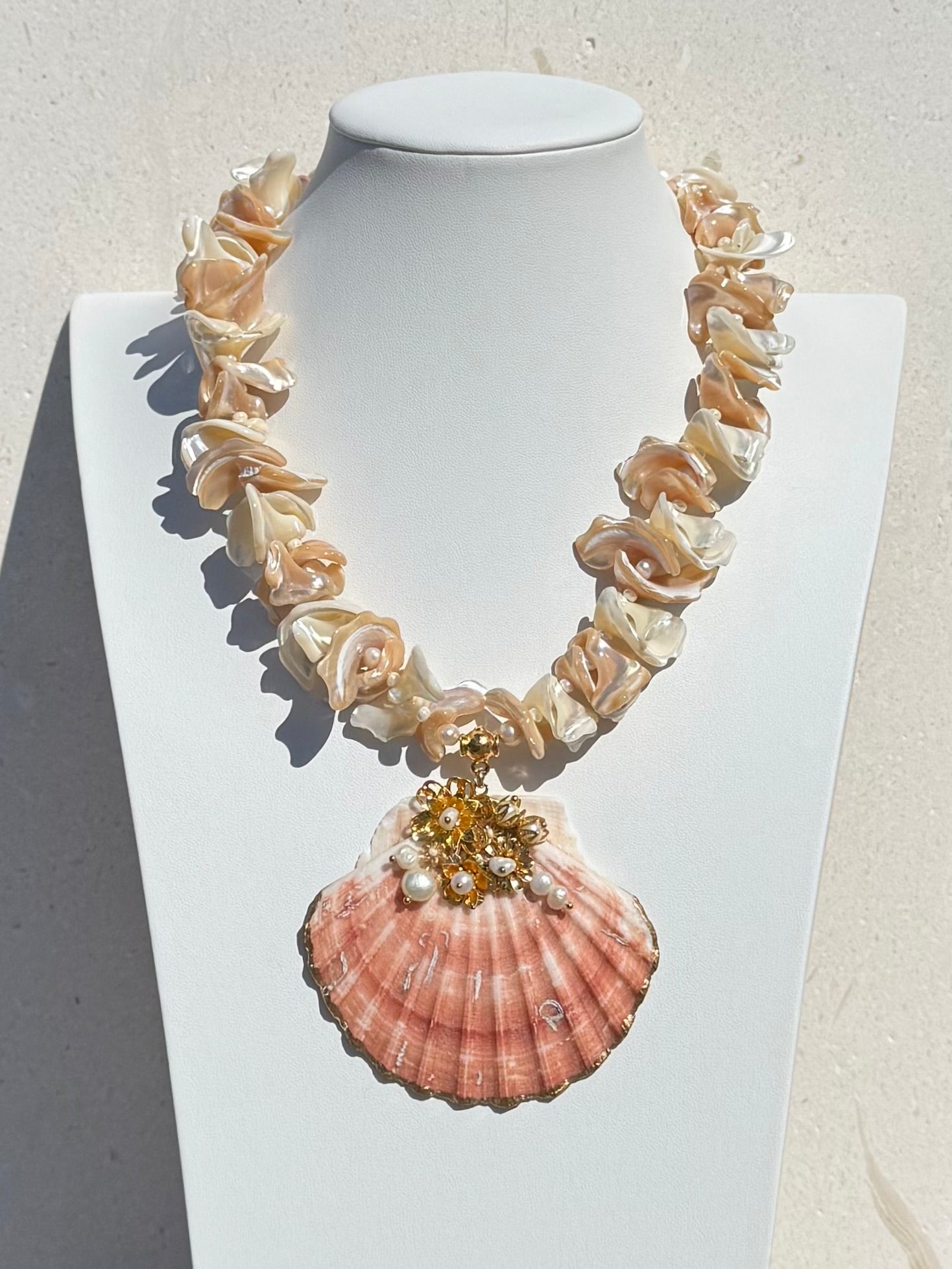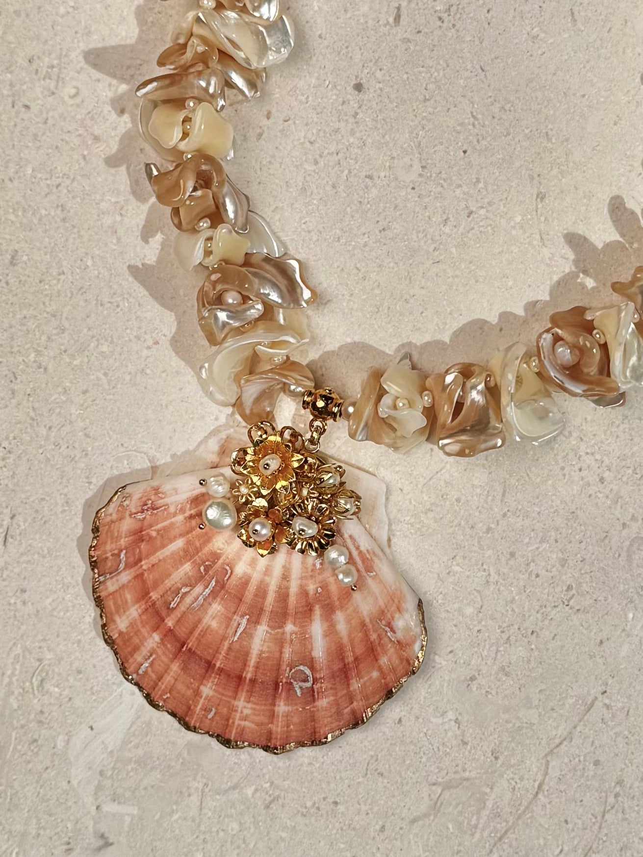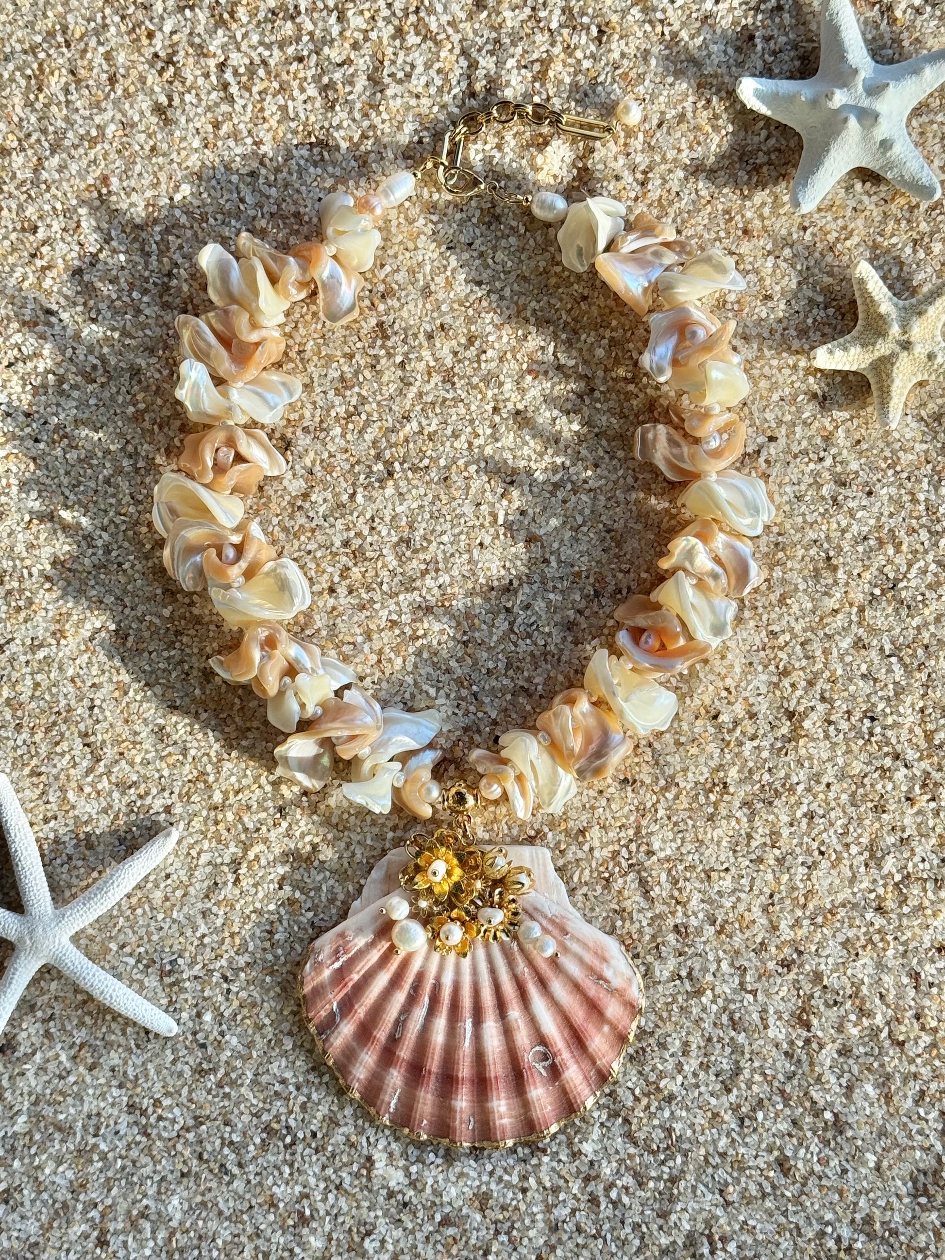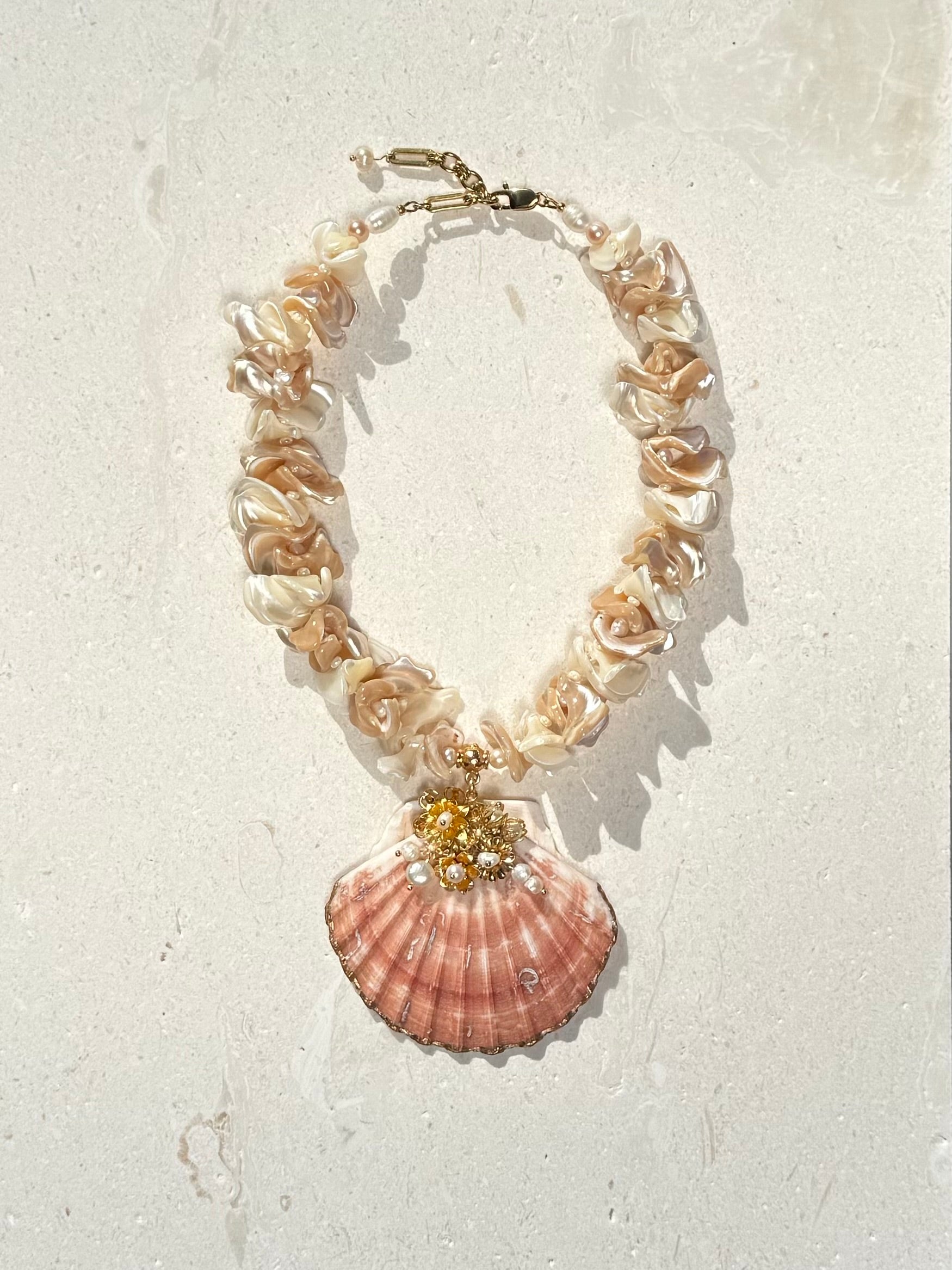 Indulge in the allure of our The Ari'i, a treasure where nature meets artistry. This exquisite piece showcases a luminous scallop shell, kissed by delicate antique gold-plated flowers, each cradling a radiant freshwater pearl. Strung along a cascade of frangia mother-of-pearl and lustrous freshwater pearls, it dances with light and elegance.